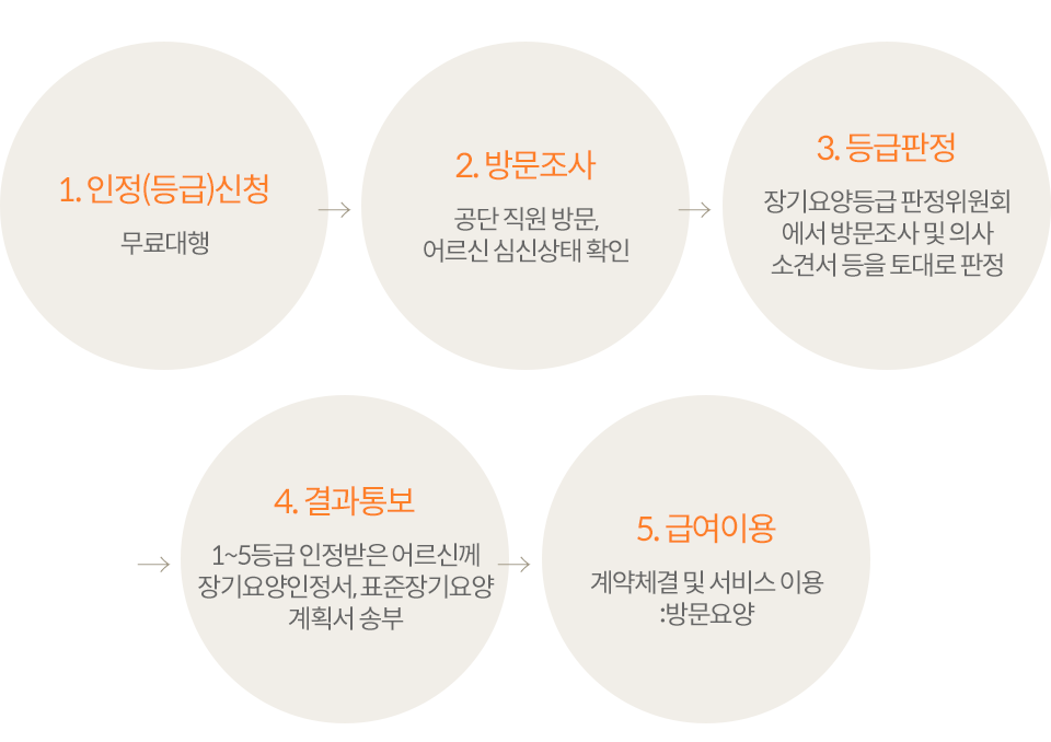 | 신청 대상 | 65세 이상의 노인 또는 65세 미만의 자로서 치매, 뇌혈관성질환 등 대통령령으로 정하는 노인성 질병을 가진 자 |